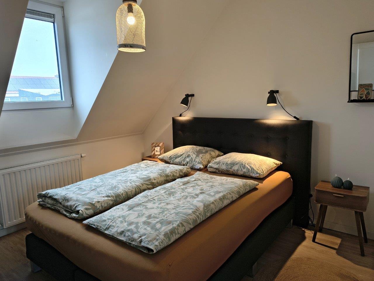 An das Wohnzimmer schließen sich zwei Schlafzimmer mit Doppel-Boxspringbetten an, von denen eines in zwei Einzel-Boxspringbetten geteilt werden kann. Die Schlafzimmer befinden sich auf der kühlen Seite des Hauses.