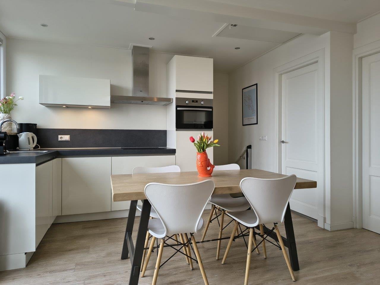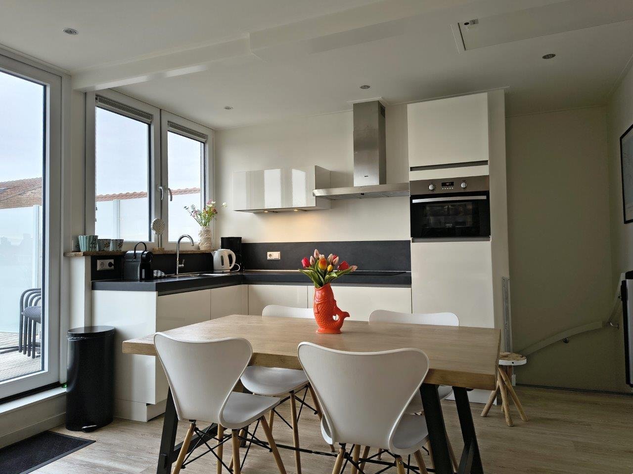 Mit Blick von der Terrasse auf die Dünen, ist diese Wohnung fantastisch. Beim Betreten von der Kloosterstraat, betreten Sie die Halle mit Modernes Badezimmer mit Dusche, WC und Waschkomfort, weiter eine separate Toilette und ein Schrank mit eingebauter Waschmaschine und Trockner. Über die einfache Treppe erreichen Sie das Wohnzimmer mit offener Küche im ersten Stock.